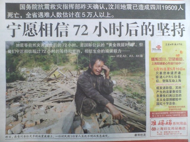 国務院地震災害対策司令部は昨日、文川地震によって既に四川19509人が死亡を確認。省全体では被害者は5万人以上に上ると見られる。