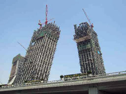 【北京24日高山昌行】北京にピサの斜塔? 来年八月の北京五輪に向け、空前の建設ラッシュに沸く北京の中心部で、斜めに傾いた二つのビルの建設が進んでいる。二○○九年一月の完成時には上部が連結され、北京の新名所になりそうだ。